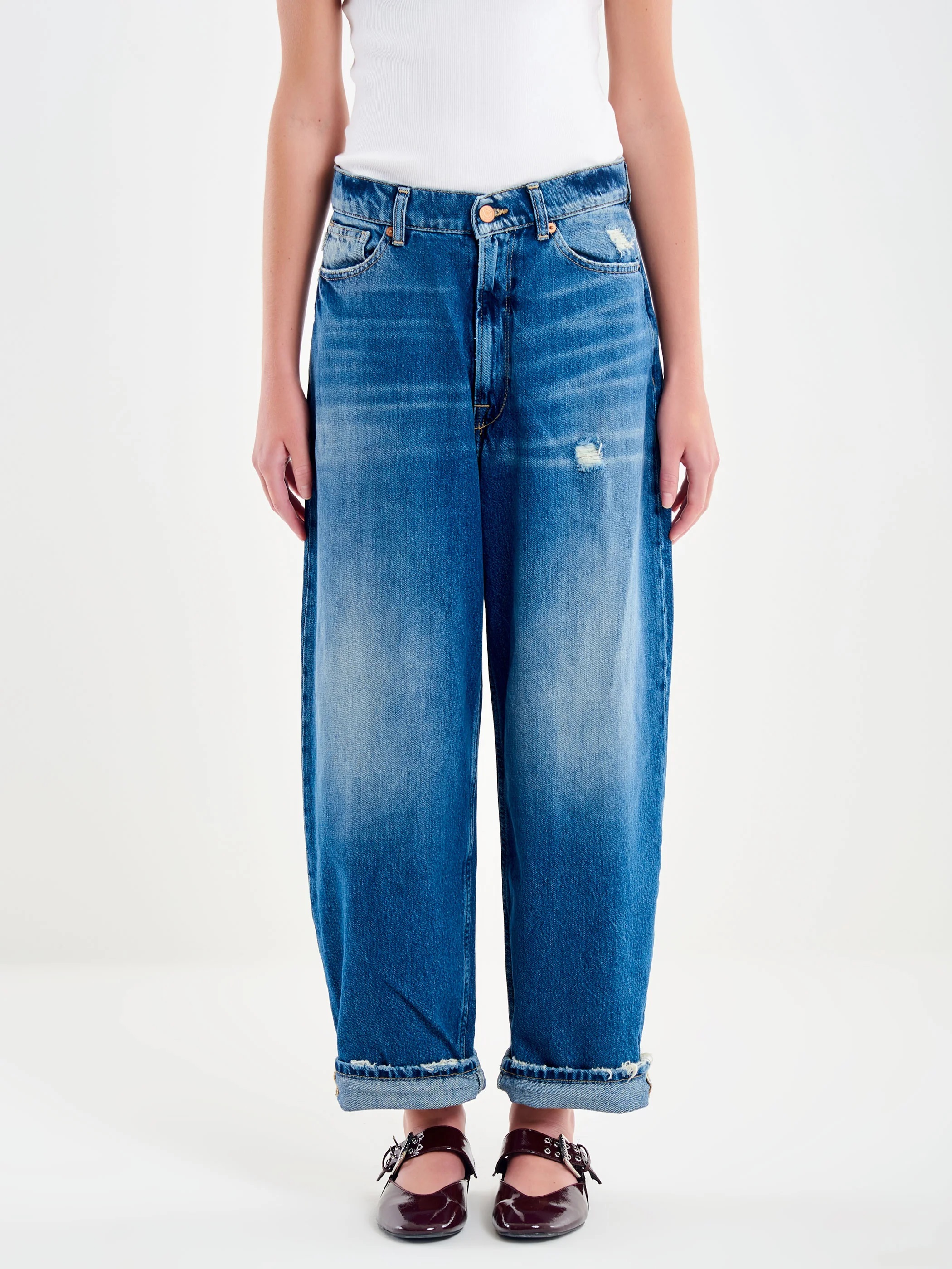 Jeans Lalia relaxed fit. Modello cinque tasche. Con Chiusura con cerniera e bottone di metallo. Dettaglio catena con perle agganciata ai passanti. Denim colore blu con mollature frontali.