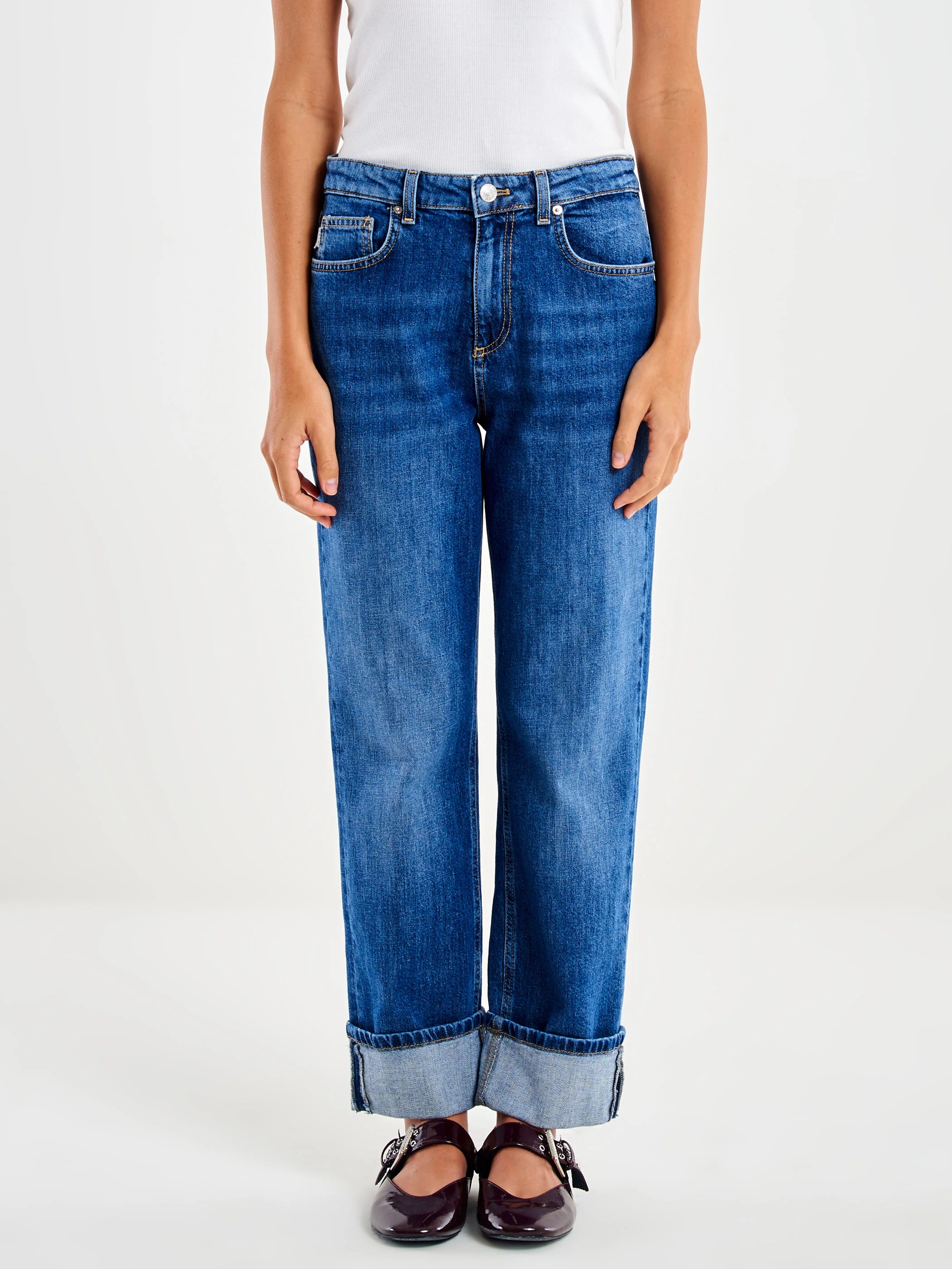 Jeans a vita alta con risvolto sul fondo. Mom fit. Cinque tasche, chiusura con cerniera e bottone in metallo. Denim Blu.
