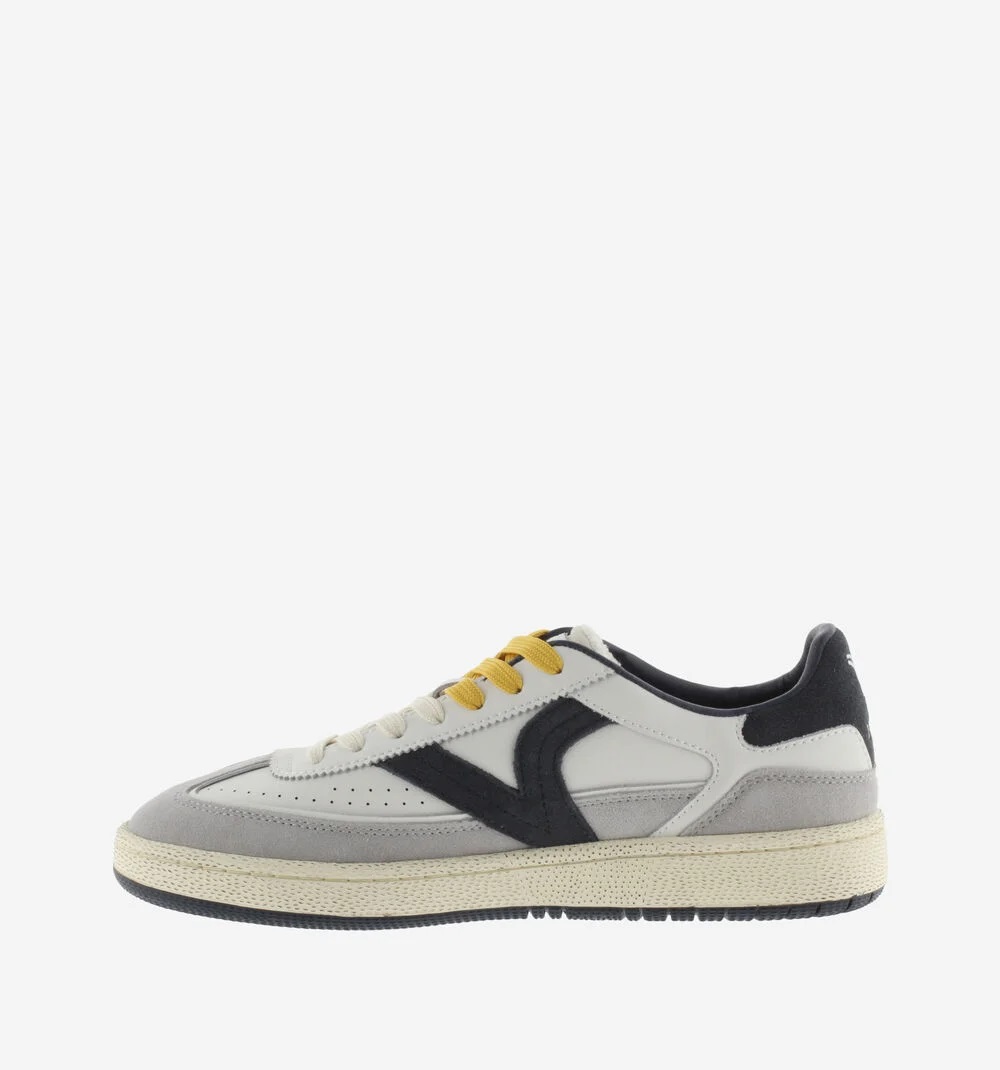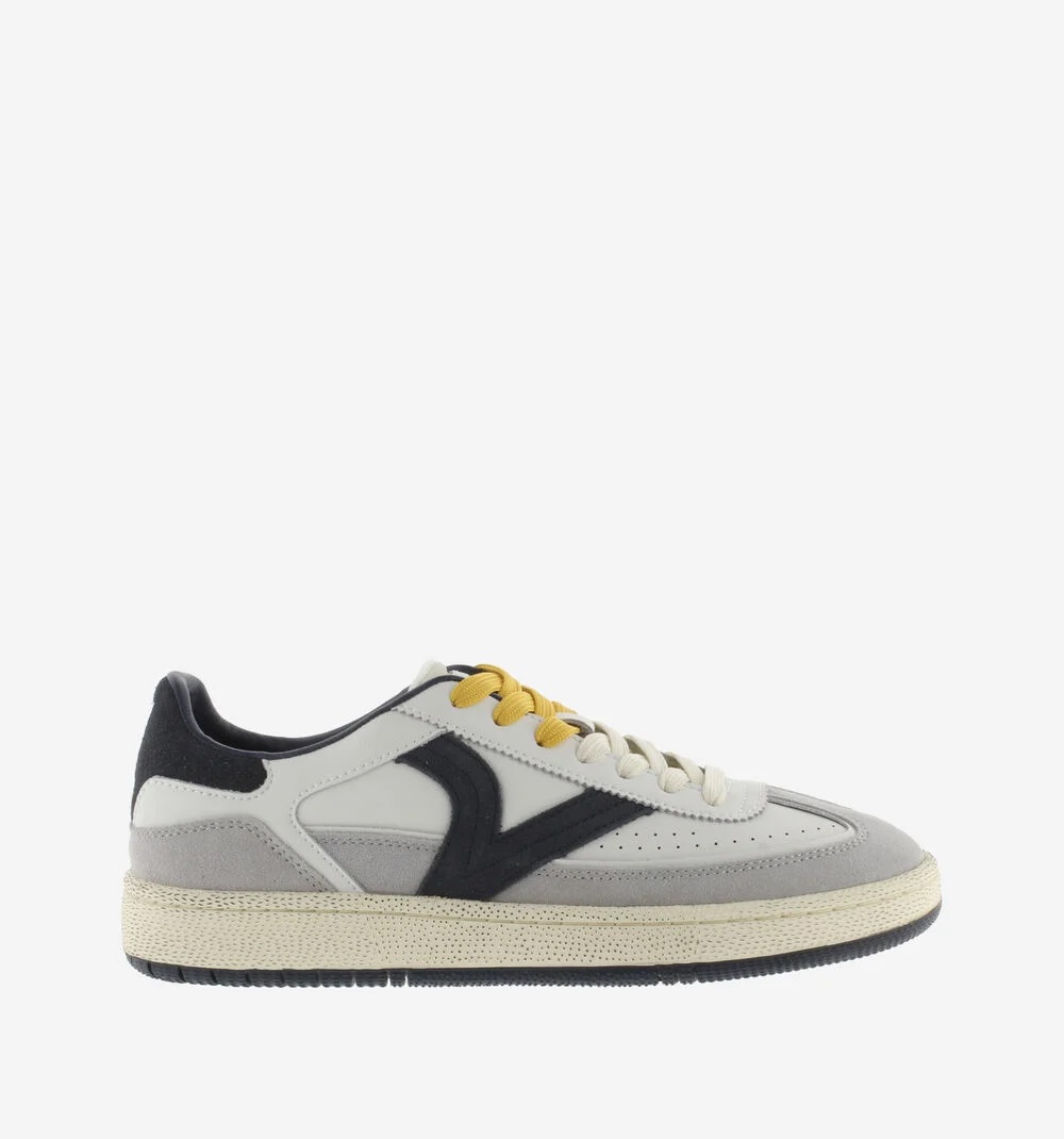 Scarpe sportive da uomo realizzate in pelle con dettagli in PU. V retro di victoria laterale e parte posteriore coordinata nei colori. Chiusura con lacci bicolore: alcuni bianchi e altri in tonalità fluo. Fodera in microfibra traspirante. Suola bicolore in gomma con finitura invecchiata e texture rugosa. Include inoltre una soletta ergonomica che si adatta alla forma del piede, offrendo una sensazione di comfort.