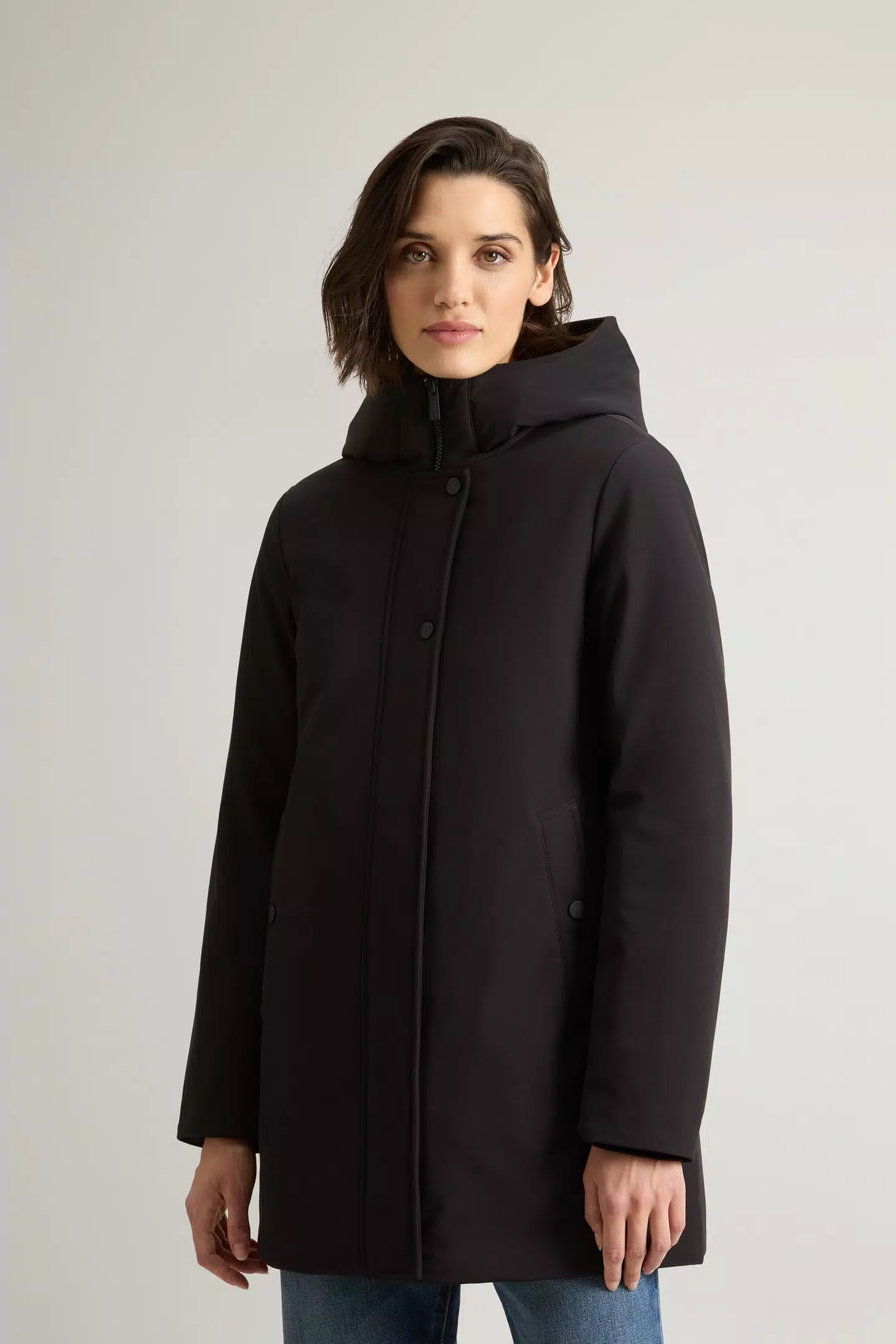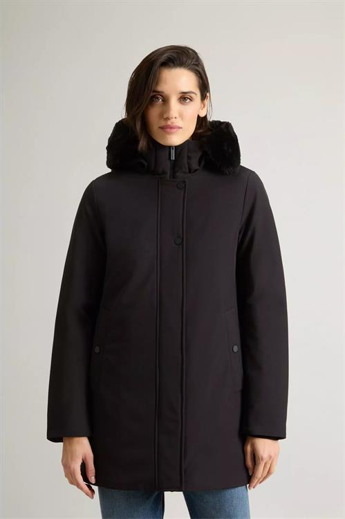 WOOLRICH GIUBBOTTO FIRTH DONNA Ideale per affrontare la stagione fredda, questo parka è realizzato in Tech Softshell, tessuto impermeabile e antivento, ed è dotato di un’imbottitura in piuma d’anatra. Presenta un cappuccio con pelliccia sintetica rimovibile, un collo alto e una chiusura lampo bidirezionale con tirazip impreziosita dal logo Woolrich nascosta da una fila di bottoni a pressione, di cui solo gli ultimi due visibili. Il modello ha due tasche a filetto con bottoni a pressione e una interna con zip, oltre ai polsini interni elasticizzati. Le bretelle interne permettono di tenerlo sulle spalle quando si entra al chiuso.