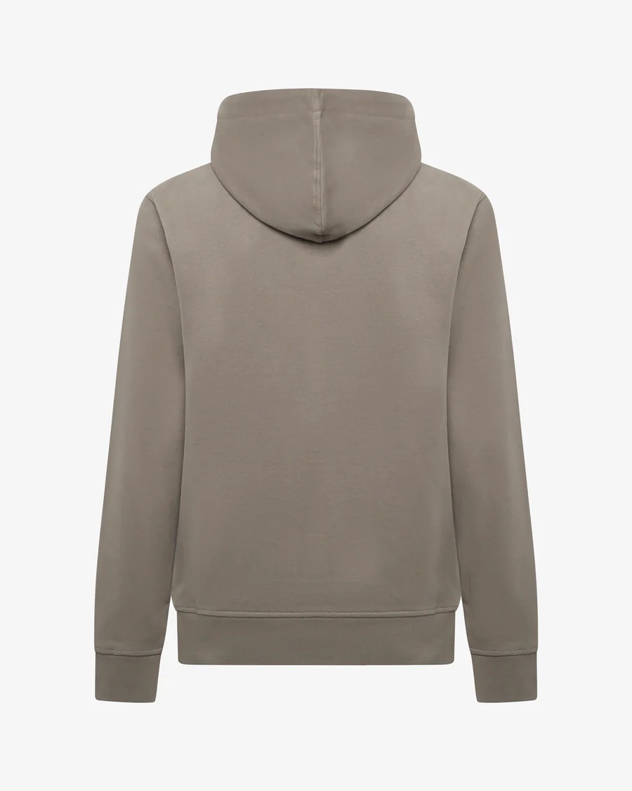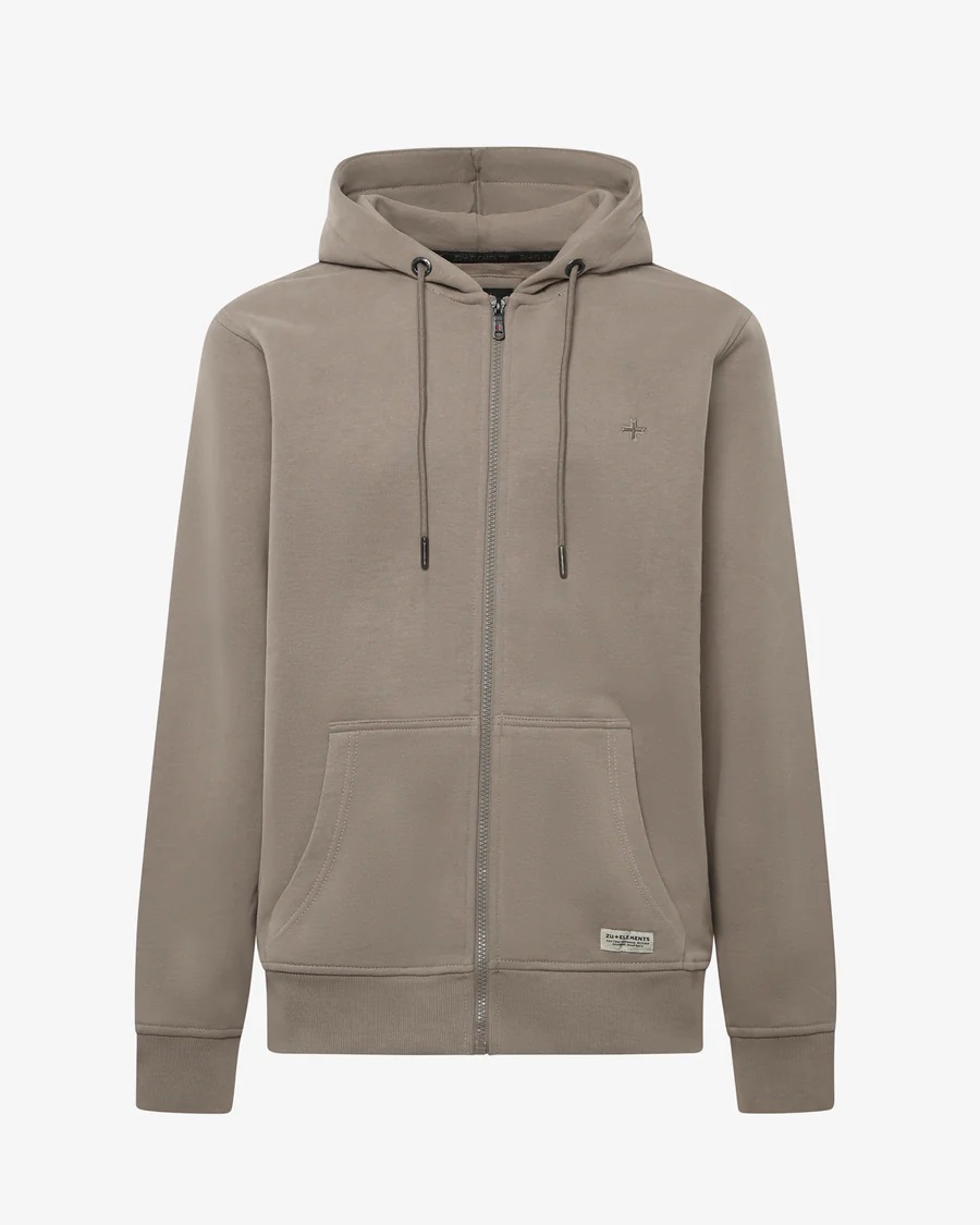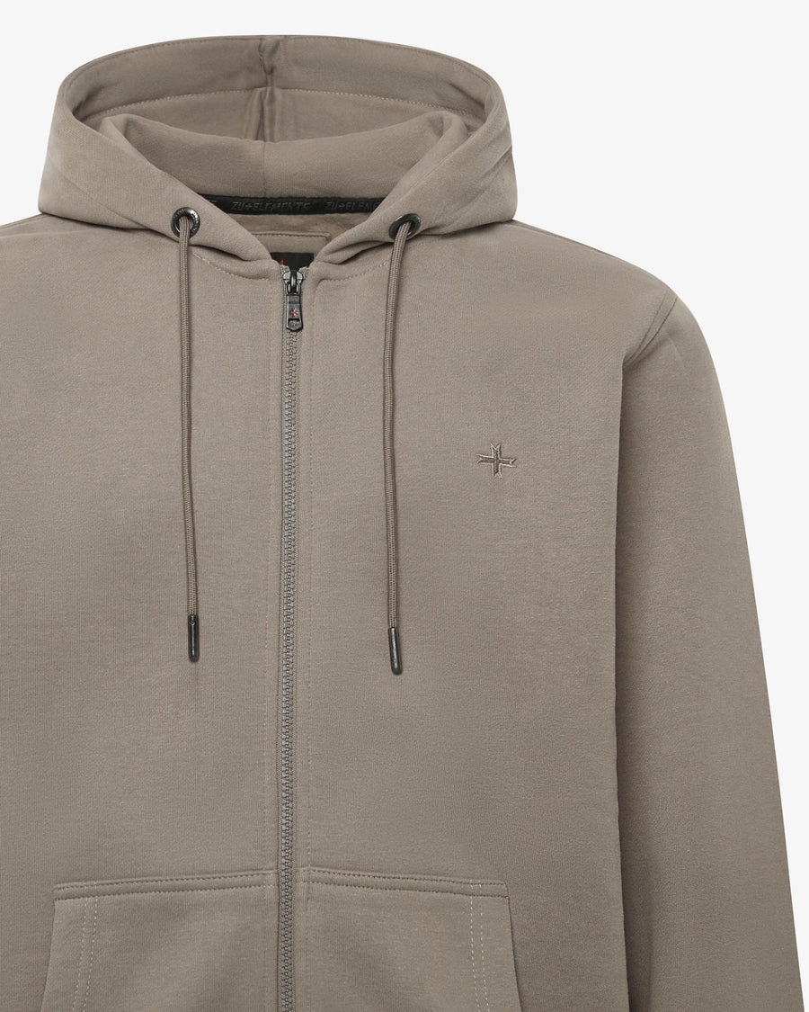 Felpa con chiusura in zip, con cappuccio e logo ricamato, tono su tono, sul davanti. Fondo e polsini a coste. 100% Cotone carbon brushed.